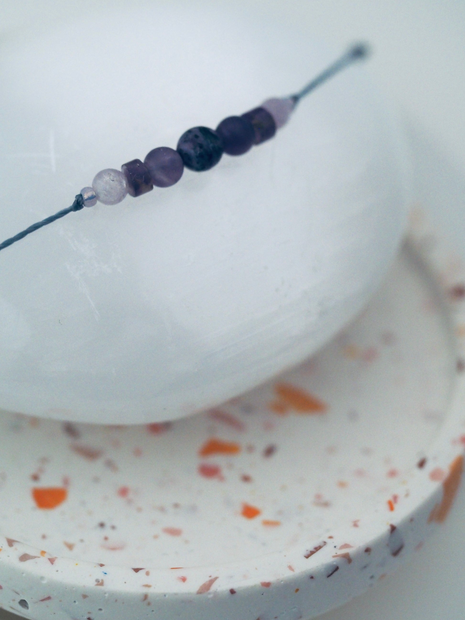 La douceur réconfortante de retrouver sa couette ( kunzite) fermer les yeux , lâcher prise ( amethyste ) et partir au pays des reves pleins de paillettes ( chariote)